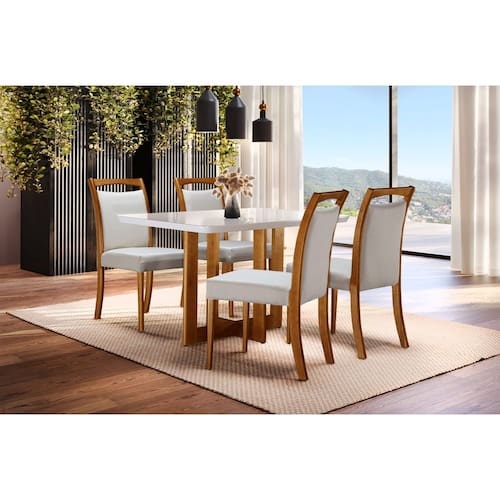 Sala de Jantar Madeira Maciça com 4 Cadeiras 1,20x0,80m - Talia - Espresso Moveis A Sala de Jantar Talia é o produto que estava faltando na sua casa. Ela possui um desing super moderno, trazendo qualidade, durabilidade e sustentabilidade. A sua base é fabricada em Madeira Maciça Tauari, madeira ecologicamente correta, seu tampo é de MDF laqueado e vidro serigrafado 4mm e não para por aqui! As Cadeiras Lívia são altamente resistentes, sendo fabricada em Madeira Maciça Tauari, a densidade de sua espuma no assento é de D-28 e D-20 no encosto. O seu tampo em formato retangular permite uma sala de jantar ampla na qual proporciona uma acomodação maior de pessoas e uma circulação agradável no ambiente. Todos os itens já vão embalados e a mesa vai semi montada e as cadeiras 100% montadas. Não necessita da montagem de um profissional, ficando ao critério do cliente. Imperdível este conjunto! Fazem parte deste anúncio: Mesa Talia 1,20x0,80m 4 Cadeiras Lívia Obs: Objetos de decorações não fazem parte deste anúncio. Particularidades da Sala de Jantar Características da Mesa: -Base em Madeira Maciça Tauari -Quinas arredondadas -Tampo em MDF laqueado -Vidro de 4mm serigrafado sobreposto ao tampo -Produto vai semi montado e embalado -Necessita de encaixe e a colocação dos parafusos Características da Cadeira: -Fabricada em Madeira Maciça Tauari -Espuma com Densidade D-28 para assento e D-20 para o encosto -Design moderno, sofisticado e diferenciado. -Madeira Ecologicamente Correta. -Baseado em conceitos sustentáveis. -Madeira altamente resistente. -Suporta até 150 kg distribuídos -Cadeiras montadas e embaladas Dimensões da Mesa: Altura: 80 centímetros Largura: 1,20 metros Profundidade: 80 centímetros Dimensões da Cadeira: Altura: 99 centímetros Largura: 45 centímetros Profundidade: 58,5 centímetros Informações Importantes: -Produtos podem apresentar diferenças de tonalidades entre a foto na tela e o produto real, devido a calibração de cor de tela. -Limpar com flanela ou pano macio. Não utilizar álcool. Não utilizar produtos abrasivos ou corrosivos -Nós prezamos pela qualidade da entrega em primeiro lugar, trabalhamos com transportadoras altamente selecionadas e os melhores materiais de embalagem. -Todos os itens já vão embalados e a mesa vai semi montada e as cadeiras 100% montadas.Não necessita da montagem de um profissional, ficando ao critério do cliente. - Não nos responsabilizamos pela montagem. -Certifique-se de que o produto caiba em elevadores e vãos de escadas, não fazemos içamentos ou desmontagens de produtos. Quaisquer despesas deste tipo ficam a cargo do cliente -Garantia de 3 meses contra defeitos de fabricação. Marca: Espresso Moveis