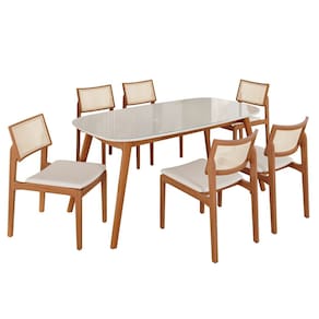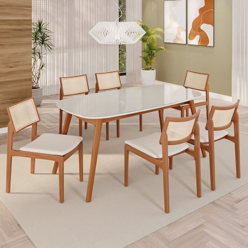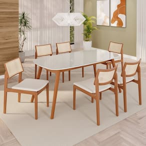 A Sala de Jantar Ceci possui um design moderno e inovador, é o ideal para você que quer aliar resistência e praticidade no dia a dia. Complete a decoração de sua sala com a mesa de jantar com 6 cadeiras. Possui estrutura em madeira maciça e tampo de vidro laqueado com canto arredondado, proporcionando design e segurança. Medida da Mesa (A x L x P): 76X160X80 Peso da Mesa: 31,5 kg Mesa suporta até: 15 kg Acabamento da Cadeira/Banco: Verniz Natural Acabamento da Mesa: Verniz Ambiente Principal: Sala de Jantar Cadeira/Banco Estofada: Somente Assento Estofado Cadeira/Banco estofada: Somente Assento Estofado Cadeira/Banco suporta até: 120 kg codigo_ean: 7900288190338 Complexidade da Montagem: Média: pode ser montado por mais de uma pessoa e/ou necessite de maior conhecimento para montagem Cor: Naturalissimo / Laca / Off White Cor do Produto: Naturalissimo / Laca / Off White Cor Secundária: Marrom De Canto (Canto Alemão): Não Escala de Brilho: Fosco Espessura do Tampo: 15 mm Formato do Tampo: Retangular Itens Inclusos: 1 Mesa, 6 Cadeiras, Manual de Montagem e Ferragens. Linha ou Coleção: Ceci Manual de Montagem e Instalação: https://product-hub-prd.madeiramadeira.com.br/959618441/documents/59aa7b76-019f-47bf-a89b-7527328985e13031785352817513090628087.pdf Marca: Yescasa Material da Base da Mesa: Madeira Maciça Material da Estrutura da Cadeira: Madeira Maciça Material do Tampo: Vidro/MDF Medida da Cadeira/Banco (A x L x P): 82x59x47 Medida do Tampo (L x C x E): 160X80X1,5 Mesa Extensível: Não Necessita Montagem: Sim Origem do Produto: Nacional Peso da Cadeira/Banco: 9,5 kg Possui Apoio Para os Pés: Não Possui Vidro: Sim Quantidade de Cadeiras: 6 Quantidade de Lugares: 06 Recomendações de Uso, Manutenção e Limpeza: Pano levemente umedecido e pano seco. Não utilizar produtos de limpeza Sistema de Montagem: Parafusos, Cavilhas e chave Allem Tipo de Madeira Maciça da Base da Mesa: Tauari