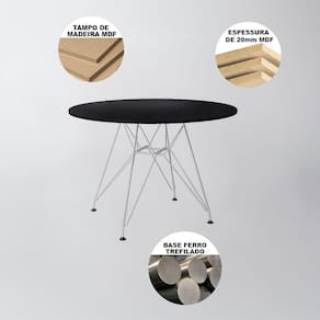 Sala De Jantar Mesa Eames Redonda Branca 90cm Base De Ferro Branco Com 4 Cadeiras PretasA Mesa Eiffel é a escolha ideal para deixar sua casa muito mais bonita e renovada. Essa mesa tem em sua estrutura materiais de altíssima qualidade, que proporciona muito mais resistência, mesmo com o passar dos anos. Ela tem formato redondo e possui espaço para 4 lugares, o que é ideal para um jantar em família. A mesa é versátil e combina com vários tipos de decoração, o que dá mais praticidade em casa.Tipo: MesaModelo: EiffelCor: Tampo Redondo BrancoDimensões do Produto- Altura: 76cm- Diâmetro:Características- Base: Madeira com ferro entrelaçado preto / branco / cobre- Tampo de Vidro / Madeira (mdp) com espessura de 25mm- Necessita Montagem? Parcialmente (Produto Entregue Montado Parcialmente)