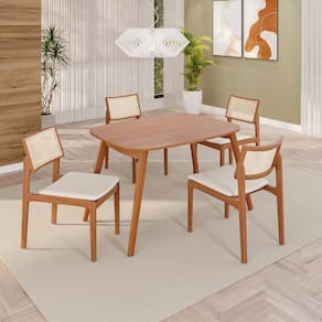 A Sala de Jantar Ceci possui um design moderno e inovador, é o ideal para você que quer aliar resistência e praticidade no dia a dia. Complete a decoração de sua sala com a mesa de jantar com 4 cadeiras. Possui estrutura em madeira maciça e tampo de madeira laminada com canto arredondado, proporcionando design e segurança.