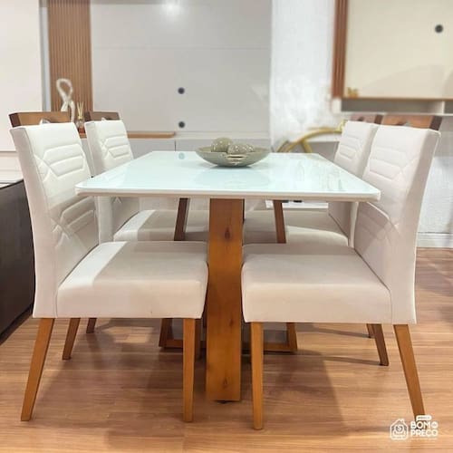 Sala de Jantar Moderna com 4 Cadeiras 1,20x0,90m - Hera Ciber - Requinte Salas A Mesa de Jantar Hera é ideal para ambientes menores. Seu formato cruzado permite o encaixe perfeito das cadeiras e facilita sua utilização em pequenos espaços residenciais. Base em madeira maciça Tauari, tampo em MDF 40mm e vidro 3mm sobreposto ao tampo. Canto Copo. Este produto é produzido respeitando e valorizando as principais práticas mundiais de sustentabilidade. As cadeiras Ciber possuem uma segurança e conforto elevada. Sua estrutura é composta por madeira maciça tauari e a densidade da espuma é D-23 para assentos e D-20 para encosto. Garanta já seu conjunto! Aproveite! Fazem parte do anúncio 1 Mesa de Jantar Hera 4 Cadeiras Ciber Obs. Objetos de decoração não inclusos. Particularidades da Sala de Jantar Características da Mesa: - Base em madeira maciça Tauari seca em estufa e imunizada - Madeira ecologicamente correta - Tampo em MDF com 40mm de espessura - Vidro 3mm - Tampo retangular com quinas arredondadas Características da Cadeira: - Madeira Tauari seca em estufa - Madeira imunizada - Espuma D-23 no assento - Espuma D-20 no encosto - Estrutura reforçada - Ecologicamente correta - Peso suportado 150kg Dimensões da Mesa: Altura: 76 centímetros Largura: 1,20 metros Profundidade: 90 centímetros Dimensões da Cadeira: Altura: 1 metro Largura: 45 centímetros Profundidade: 61 centímetros Informações Importantes: - Produtos podem apresentar diferenças de tonalidades entre a foto na tela e o produto real, devido a calibração de cor de tela. - Limpar com flanela ou pano macio. Não utilizar álcool. Não utilizar produtos abrasivos ou corrosivos - Nós prezamos pela qualidade da entrega em primeiro lugar, trabalhamos com transportadoras altamente selecionadas e os melhores materiais de embalagem. - Todos os itens já vão embalados, a mesa vai semi montada e as cadeiras 100% montadas. Não necessita da montagem de um profissional, ficando ao critério do cliente. Não nos responsabilizamos pela montagem. - Objetos de decoração não incluso. - Certifique-se de que o produto caiba em elevadores e vãos de escadas, não fazemos içamentos ou desmontagens de produtos. Quaisquer despesas deste tipo ficam a cargo do cliente - Garantia de 3 meses contra defeitos de fabricação. Marca: Requinte Salas