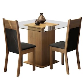 - Itens Inclusos: 1 mesa com tampo quadrado de vidro; 2 cadeiras com encosto em madeira e assento estofado