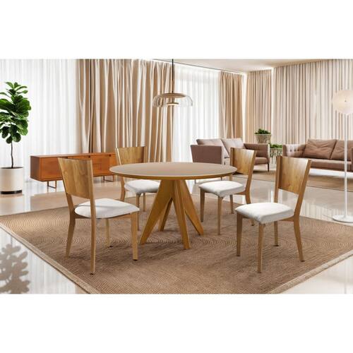 Sala de Jantar Redonda com Vidro Madeira Maciça 4 Cadeiras 1,30m - Ametista - Harmonia Salas A mesa de jantar Ametista é um móvel ideal para sua casa, com design moderno e elegante, que vai agregar a sua decoração tornando sua sala de jantar mais aconchegante! Ela tem a base com um formato que deixa amplo espaço para o encaixe das cadeiras, charmosa e clean. Esse modelo tem a base em madeira maciça de Eucalipto e o tampo em MDF laminado com vidro sobreposto de 4mm, garantindo uma mesa resistente e duradoura. As cadeiras para mesa de jantar Violeta, possuem um estilo elegante e moderno para deixar sua sala de jantar mais bonita e confortável. A cadeira Violeta conta com um encosto em madeira, que proporciona um charme a mais a esse modelo. O assento é fabricado com espuma de densidade D-23 reforçando o conforto do produto, sua estrutura é toda em madeira maciça de eucalipto, ecologicamente correta. Devido à fabricação manual, o que compete ao produto um acabamento impecável, o tempo solicitado é um pouco maior do que o convencional por isso pedimos um prazo um pouco maior do que a maioria dos produtos. No entanto, garantimos que o resultado vale a pena. Faz parte do anúncio: 1 Mesa de Jantar Redonda Ametista com Vidro 1,30m 4 Cadeiras Violeta Obs.: Objetos de decoração não acompanham o produto. Particularidades da Sala de Jantar: Características da Mesa: - Base em madeira maciça de Eucalipto; - Tampo em MDF laminado; - Vidro sobrepsoto de 4mm; - Tampo redondo; - Acabamento em verniz PU semi-fosco; - Madeira tratada e seca em estufa; - Design moderno, sofisticado e diferenciado; - Madeira Ecologicamente Correta; - Baseado em conceitos sustentáveis; Dimensões da Mesa: Altura: 78 centímetros Diâmetro: 1,30 metros Características da Cadeira: - Madeira Maciça de Eucalipto seca e tratada em estufa; - Madeira imunizada; - Espuma D-23; - Estrutura reforçada; - Ecologicamente correta; - Peso suportado recomendado 150kg. Dimensões da Cadeira: Altura: 89 centímetros Altura do assento: 48 centímetros Largura: 44 centímetros Profundidade: 44 centímetros Informações Importantes: - Produtos podem apresentar diferenças de tonalidades entre a foto na tela e o produto real, devido a calibração de cor de tela. - Limpar com flanela ou pano macio. Não utilizar álcool. Não utilizar produtos abrasivos ou corrosivos - Nós prezamos pela qualidade da entrega em primeiro lugar, trabalhamos com transportadoras altamente selecionadas e os melhores materiais de embalagem. - As cadeiras vão 100% montadas nas caixas e embaladas. Não necessita da montagem de um profissional. - Objetos de decoração não incluso. - Certifique-se de que o produto caiba em elevadores e vãos de escadas, não fazemos içamentos ou desmontagens de produtos. Quaisquer despesas deste tipo ficam a cargo do cliente - Garantia de 3 meses contra defeitos de fabricação. Marca: Não Informado