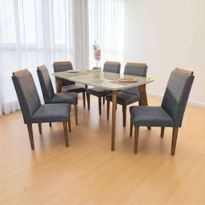Que tal o Conjunto de Mesa de Jantar Jade com Cadeiras Arezzo? Com o Conjunto Jade Arezzo, sua sala de jantar será o cenário perfeito para momentos memoráveis. Composto por uma mesa com tampo em MDF de 30 mm espessura, pés em madeira maciça e 6 cadeiras estofadas em espuma, revestidas em tecido linho com pês de madeira maciça, este kit proporciona conforto e praticidade para o seu dia a dia. A mesa, com seu design moderno, tem tampo com aplicação de vidro, adicionando um toque de elegância ao ambiente. Por falar nisso, o visual sofisticado das peças é evidenciado pela valorização do tom amadeirado e a coloração neutra, tornando sua casa ainda mais encantadora e bonita. Com esse conjunto, temos certeza que você e sua família partilharão ótimos momentos juntos