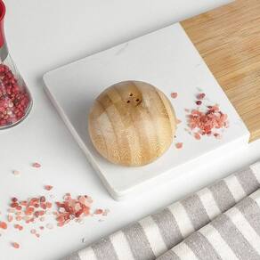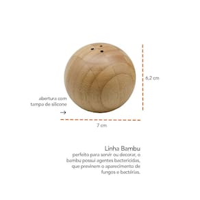 Saleiro de bambu esferico. O saleiro em formato de bola é produzido em bambu e a abertura inferior para adicionar o sal possui tampa de silicone. Os utensílios em bambu possuem agentes bactericidas, que previnem o aparecimento de fungos e bactérias. São resistentes e com menor absorção de líquidos, se forem bem conservados, não ficam escuros com facilidade. Como o interior do saleiro é em bambu não deixa que o sal fique úmido deixando o sal soltinho e fino. E por ser orgânico e natural, pode ocorrer leves variações de tonalidade.