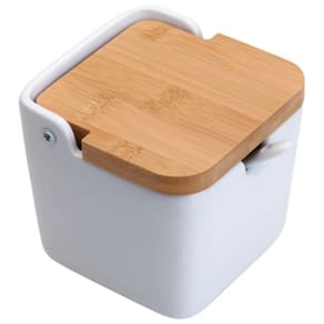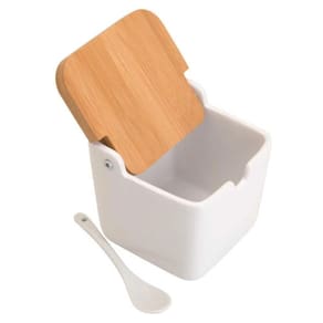 Saleiro De Mesa Em Porcelana Com Tampa de Bambu e Colher