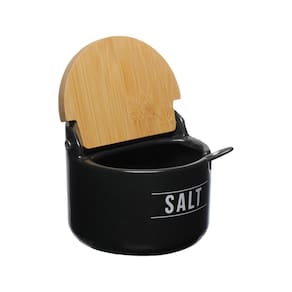 Saleiro de Porcelana Preto com Tampa de Bambu e Colher de Porcelana