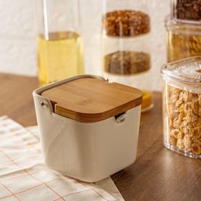 Saleiro em cerâmica tradicional tampa bambu e colher 10,5cm o saleiro com tampa em bambu vai ajudar a deixar sua cozinha mais organizada e preparar os seus alimentos com mais praticidade, além de ser uma peça decorativa linda. Produzido em cerâmica, já vem com a colher e tem capacidade para cerca 400ml, podendo ser utilizado para sal, alho ou tempero de sua preferência. Características do produto material: cerâmica e bambu dimensões axlxp : 10 x 10,5 x 10,5 cm capacidade aproximada: 400ml