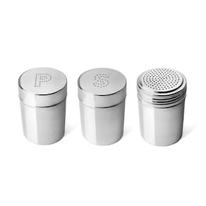 Contêm: 1 Saleiro 1 Pimenteiro 1 Porta Tempero Dimensão: 6,5 x 9 cm 1 Espátula Multiuso Dimensão: 15 x 11 x 2,5 cm Material: Aço Inoxidável Casacha é uma loja online de artigos para casa, cozinha, banheiro e lavanderia.