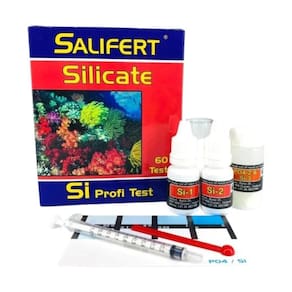 Com o teste de silicato salifert profi é possível determinar o teor de silicato na água do mar ou água doce com exatidão e facilidade. Silicato ocorre especialmente em água corrente ou em água purificada, quando a unidade de ro ou di não está funcionando corretamente. Silicato não só resulta em diatomáceas, mas pode também bloquear alguns oligoelementos essenciais, tais como vanádio e molibdênio. Para água doce, não usar água da torneira ou água de osmose com conteúdo silicato de mais de 2 mg/l.