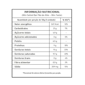 Descrição: Mrs salted bar é uma barrinha de proteína salgada e assada ela é sem glúten e conta com 9g de proteínas por barra.
