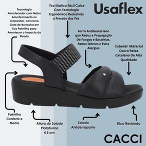 A Sandália UsaFlex tem seu cabedal em couro relax catalano e possui seu diferencial que é o detalhe em elástico na parte superior dos pés trazendo firmeza aos pés. Trás um fácil calce adptável ergonimicamento e reduz a pressão nos pés.