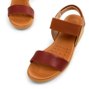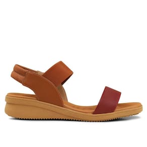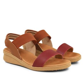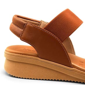Sandália plataforma bicolor em couro liso rebu com traseiro em couro e lycra canela. O modelo possui tecnologia Calce Fácil, com design facilitado em adaptar o calçado a ergonomia dos pés.