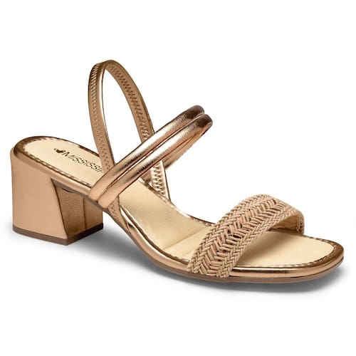 A Sandália Mississipi de Salto Bloco é prática e elegante. Seu design minimalista e atemporal a torna versátil, destacando a tira larga com tramados e brilhos que forma a parte frontal, conferindo um ar artesanal ao modelo.