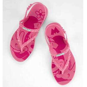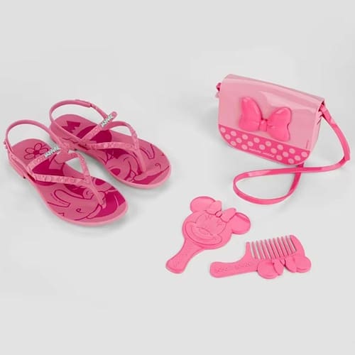 O destaque fica por conta da personagem Minnie que permite ajustar o calce no peito do pé.