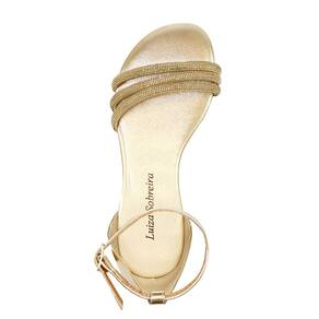 Linha de Rasteira Luiza Sobreira, produzida em material sintético metalizado na cor dourada com detalhes em strass, bico redondo, com palmilha em espuma ergonômica e forro em P.U., solado em TR.