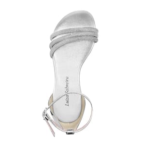 Linha de Rasteira Luiza Sobreira, produzida em material sintético metalizado na cor prata com detalhes em strass, bico redondo, com palmilha em espuma ergonômica e forro em P.U., solado em TR.