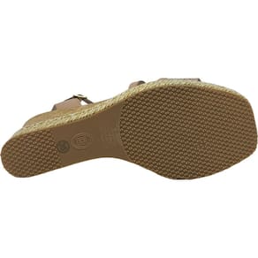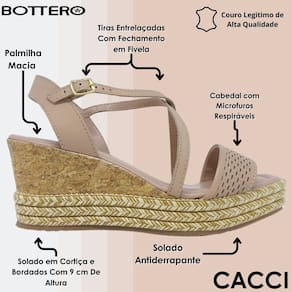 A sandália anabela em couro atanado tem um estilo moderno e elegante. O salto anabela alto, com 9 cm de altura, é detalhado em material natural e cortiça, trazendo um toque rústico e sofisticado ao mesmo tempo. A parte traseira da sandália é aberta, mas possui uma tira ajustável, garantindo um ajuste firme e confortável.