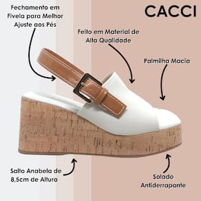 Transforme seu estilo com a Sandália Anabela Salto Médio Cacci! Conforto, segurança e elegância em um só modelo, ideal para qualquer ocasião. Adquira a sua agora e caminhe com a confiança e o charme que você merece!