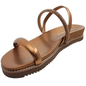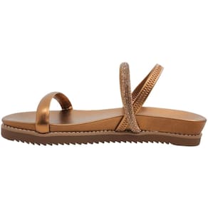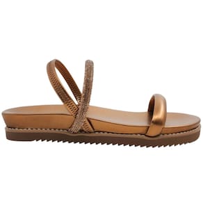 A tira coberta por strass adiciona um toque de brilho ao seu passo, fazendo você brilhar em cada ocasião. Com solado emborrachado e calce fácil, garantido pela tira elástica no calcanhar, esta sandália não só proporciona estilo, mas também segurança em cada passo, seja na cidade, na praia ou em qualquer aventura de verão.