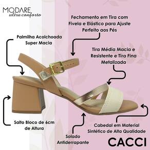 A Sandália Modare para garantir maior conforto e segurança ao caminhar, a sandália possui tecnologia ultraconforto, proporciona maciez e bem estar durante o uso, com alta absorção de impacto e umidade, além de solado emborrachado antiderrapante deixando o caminhar seguro e aderente, salto baixo bloco com a altura de aproximadamente 6cm. O salto é em formato bloco e fachetado de material napa. Super indicada para quem sofre com dores de esporão.