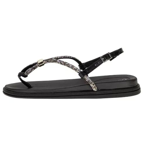 O design clean e sofisticado da sandália é enriquecido pelos detalhes em strass, conferindo um toque de brilho discreto e refinado. As tiras delicadas proporcionam um visual leve e feminino, enquanto o formato flat oferece praticidade e conforto, tornando este calçado perfeito para o dia a dia.