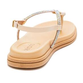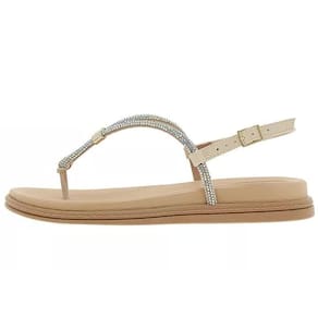 O design clean e sofisticado da sandália é enriquecido pelos detalhes em strass, conferindo um toque de brilho discreto e refinado. As tiras delicadas proporcionam um visual leve e feminino, enquanto o formato flat oferece praticidade e conforto, tornando este calçado perfeito para o dia a dia.
