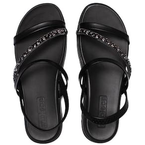 O destaque fica por conta da tira com pedrarias na parte frontal, que adiciona um toque elegante e glamouroso ao calçado.