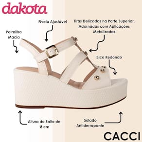A Sandália Dakota Anabela é o modelo perfeito para quem busca elegância e conforto em um único calçado. Com design moderno e toque artesanal, ela se destaca pelo salto de 8 centímetros em estilo plataforma, que garante estabilidade e alonga a silhueta de forma natural. O visual é complementado pelas tiras delicadas com aplicações metalizadas, que trazem brilho sutil e sofisticação ao look.