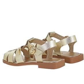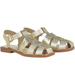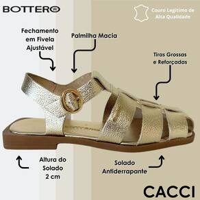 Sandália Pescadora em couro atanado. De solado rasteiro com palmilha macia e confortável com seu solado antiderrapante com saltinho de 2 cm de altura. O modelo possui tira larga central sobre o pé e tiras largas na horizontal, exibindo parte do pé. Possui traseiro aberto com tira ajustavel e fechamento prático de metal dourado.