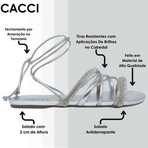 Possui sua tira com ajuste em amarração proporcionando um fácil calce, acompanhada lindas tiras com aplicações de strass tornando-a mais especial e bela, seu solado é antiderrapante e trás muita segurança ao caminhar. Sua palmilha macia e confortável, permanecendo sempre o conforto para todas as ocasiões. Leve com você os melhores calçados, vá para todos os lugares e combine looks incríveis com ela. Adquira já a sua Cacci!