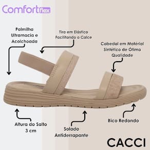 A Sandália Comfortflex Casual Feminina Elástico possui cabedal confeccionado em material sintético, proporcionando leveza e durabilidade. A palmilha é em EVA, que garante conforto e maciez ao caminhar, adaptando-se ao formato dos pés. O solado é feito de PVC expandido, oferecendo excelente aderência e resistência ao desgaste, ideal para o uso diário. O salto é anabela, com aproximadamente 3 cm, equilibrando conforto e elegância. As tiras são ajustáveis, em elástico, permitindo um encaixe perfeito aos pés. Com uma calcanheira levemente estruturada e bico arredondado, essa sandália possui fechamento em elástico ajustável no calcanhar, facilitando o calce, e seu acabamento é impecável, trazendo sofisticação ao design. A Sandália Comfortflex é a escolha ideal para quem busca estilo e conforto em qualquer ocasião