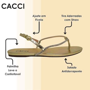 A Sandália Rasteira Cacci é a combinação perfeita de sofisticação e praticidade. Com tiras adornadas em strass, ela traz um brilho delicado que valoriza qualquer look, seja para o dia a dia ou ocasiões especiais.