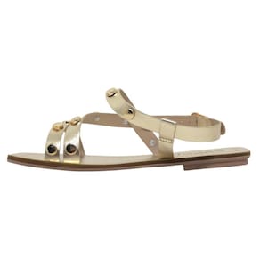 Detalhes em Pins Dourados: O toque de glamour fica por conta dos pins dourados, que trazem uma dose extra de sofisticação ao visual. Um detalhe único que transforma essa rasteirinha em uma peça indispensável no seu guarda-roupa.