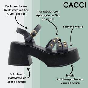 A nova Sandália Salto Médio Plataforma da Cacci é a escolha perfeita para quem busca unir elegância e conforto em um só calçado. Com um design moderno e sofisticado, ela traz o charme das tiras trançadas com detalhes em pins dourados, que adicionam um toque de glamour ao visual. O salto bloco plataforma de 8 cm, com solado antiderrapante e altura de 5 cm na parte frontal, oferece estabilidade e segurança para que você se sinta confiante a cada passo. Ideal para compor looks que vão do casual ao elegante, essa sandália é uma combinação perfeita de estilo e praticidade.