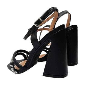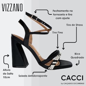 A Sandália é confeccionada em material sintético de alta qualidade e durabilidade. Seu cabedal é composto por duas tiras, uma das quais é adornada com strass, adicionando um toque de charme ao modelo. A palmilha é super macia e espumada, proporcionando conforto ao longo do dia. O fechamento é feito por meio de uma tira lateral ajustável, e duas tiras cruzadas próximas ao tornozelo adicionam um toque de estilo. O salto geométrico tem aproximadamente 10,0cm de altura e o solado é feito de PVC cristal.
