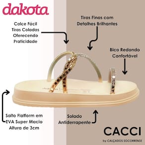 A Sandália Calce Fácil Dakota Flatform com Brilhos conta com sola anatômica de EVA super Macia, proporcionando uma experiência leve e suave para seus pés, tornando-a perfeita para o dia a dia ou momentos de lazer. O toque de glamour fica por conta das tiras revestidas de brilhos que envolvem delicadamente o pé, elevando a sofisticação dos seus looks. Feita com material sintético premium de alta qualidade, esta sandália não apenas é estilosa, mas também é durável e resistente, garantindo que você esteja sempre na moda, independente da ocasião.