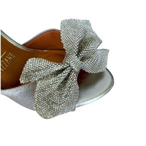 Sandália Feminina Vizzano Salto Alto Destalhe Laço Sandália Feminina Vizzano Salto Alto Destalhe Laço possui um cabedal em lona metálica, oferecendo um acabamento elegante. O material de fabricação é lona com detalhes em metal, garantindo durabilidade e estilo. O bico é simétrico, com tiras de espessura média posicionadas em sentido reto próximo aos dedos. O fechamento é feito por fivela lateral, facilitando o ajuste. A construção é delicada, com salto alto de aproximadamente 10 cm. A palmilha é acolchoada para conforto, e a calcanheira é levemente estruturada. O forro interior é em material têxtil, e o solado é em emborrachado, proporcionando aderência. O estilo é sofisticado com um design moderno e detalhes decorativos metálicos.