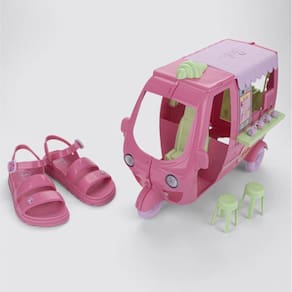 Uma combinação perfeita de conforto e imaginação! A sandália Barbie com sorveteria traz um design lúdico inspirado nos icônicos tuk-tuks indianos e acompanha uma incrível sorveteria em miniatura. Decorado com temática de sorvete, o brinquedo possui rodinhas funcionais, toldo retrátil, porta traseira para acesso das bonecas, banco para a motorista e topo com um divertido sorvete derretido. Vem com diversos acessórios para estimular a criatividade: dois bancos na altura ideal para a Barbie, pia, máquina de milkshake, colher de sorvete e seis preparos prontos para soltar a imaginação.