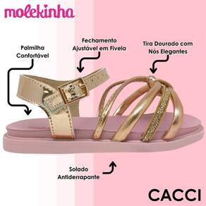 O solado antiderrapante garante firmeza e segurança em diferentes superfícies, permitindo que a criança brinque e caminhe com confiança. Leve, confortável e cheia de estilo, a sandália Molekinha é ideal para passeios, festas e momentos de lazer, proporcionando liberdade e charme em cada movimento.