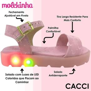 A sandália Molekinha foi desenvolvida para encantar com brilho, conforto e diversão em cada passo. Seu design moderno combina delicadeza e praticidade, trazendo um toque especial com luzes de LED no solado que piscam ao caminhar, tornando os momentos das pequenas ainda mais alegres e cheios de estilo. A palmilha macia garante conforto prolongado, permitindo o uso durante todo o dia sem causar desconfortos.