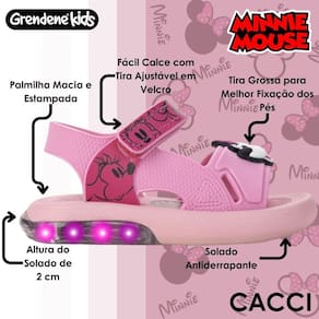Além do solado e as tiras estampadas, a sandália também conta com um aplique na parte superior dando mais destaque ao personagem. O grande diferencial fica por conta das luzes led multicoloridas que piscam, localizadas na parte traseira da sola. O fechamento autocolante, permitindo um calce fácil e seguro.
