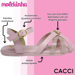 O destaque fica por conta da tira adornada com glitter, que confere um toque sofisticado e delicado ao visual. O pingente dourado agrega charme e personalidade, transformando o calçado em uma peça versátil para diferentes ocasiões, seja para passeios, eventos ou momentos de lazer. Cada detalhe foi cuidadosamente planejado para unir estilo e funcionalidade, garantindo que o calçado se destaque sem perder o conforto.