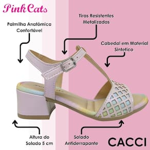 Com solado antiderrapante, essa sandália oferece mais firmeza e confiança em cada passo, ideal para o dia a dia das meninas que estão sempre em movimento. Além disso, o salto de 5 cm confere um toque moderno e delicado, perfeito para ocasiões especiais ou momentos de lazer. A Pink Cats pensou em cada detalhe para unir beleza, conforto e praticidade em um único modelo que vai fazer sucesso entre as pequenas fashionistas.