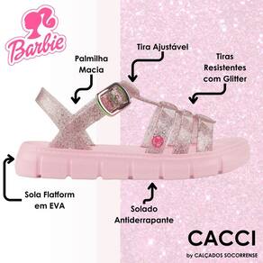 A sandália da Barbie que é um sucesso vem com novas opções de cores. Ela é super fashion para as meninas conectadas com esse universo da moda. A sola flatform é de EVA, deixando o produto leve e confortável. As tiras vêm inspiradas nos modelos das fishermens que seguem fortes como indicação de moda.