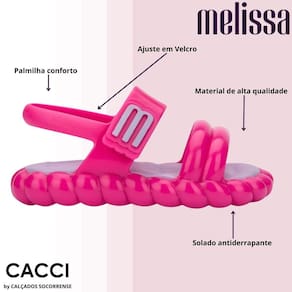 Confeccionada em material Melissa, a sandália oferece flexibilidade, resistência e fácil limpeza. A palmilha anatômica proporciona conforto excepcional, garantindo suporte adequado para os pezinhos em crescimento. O fechamento autocolante é prático e seguro, permitindo um ajuste personalizado e facilitando na hora de calçar e descalçar.