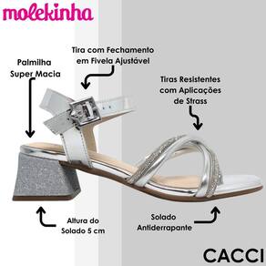 A Sandália de Salto Molekinha Infantil Menina possui cabedal em material sintético de alta qualidade. Seu formato apresenta bico arredondado, ideal para acomodar os pés das crianças com conforto. O fechamento é feito por ajuste prático, garantindo um ajuste firme e seguro, enquanto a abertura facilita o calce. Com construção ergonômica, a sandália oferece palmilha macia e promovendo bem-estar durante o uso. Suas tiras resistentes com aplicações de strass trazendo todo o charme ao calçado. Seu design leve e maleável permite liberdade nos movimentos, e os pequenos detalhes em costura nas laterais agregam estilo e delicadeza ao visual.