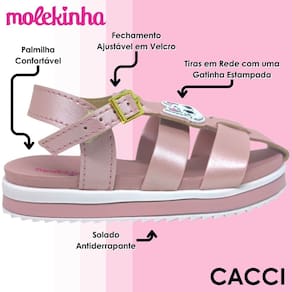 Essa sandália Molekinha é a união perfeita entre conforto, diversão e estilo. Seu design encantador traz tiras com estampa de gatinha, um detalhe que deixa o visual ainda mais fofo e cheio de personalidade. A palmilha macia proporciona uma pisada suave, tornando o uso leve e agradável para o dia todo, ideal para acompanhar as pequenas em passeios, festas e momentos de lazer.