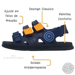 Esta sandália apresenta uma parte superior resistente e durável, confeccionada com materiais de alta qualidade, projetados para enfrentar todas as brincadeiras e atividades dos pequenos. O destaque fica por conta dos detalhes inspirados nos super-heróis da Marvel que adornam a parte frontal da sandália, incluindo os logotipos e elementos de design característicos dos personagens favoritos das crianças.