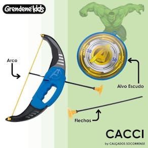 A sandália é totalmente personalizada com os heróis favoritos das crianças: Capitão América, Hulk e Homem de Ferro, além de trazer mais segurança para brincadeira com o fechamento prático. Vem junto com arco e flecha e um alvo em formato de escudo dos Vingadores, para a criança poder se tornar um verdadeiro herói.